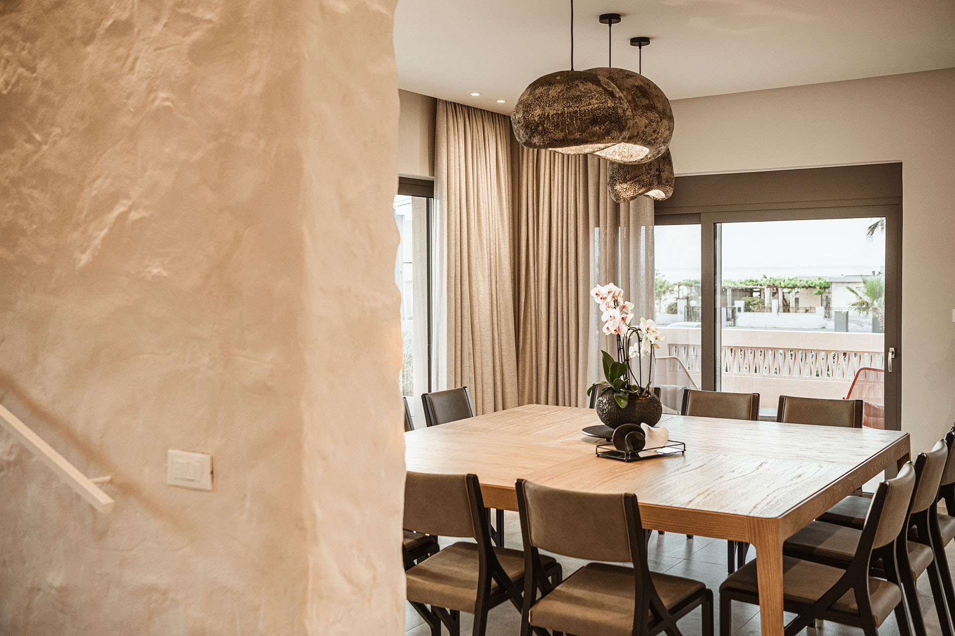 - Dining area with a big table for 12 guests, direct access to the pool, and a sea view
